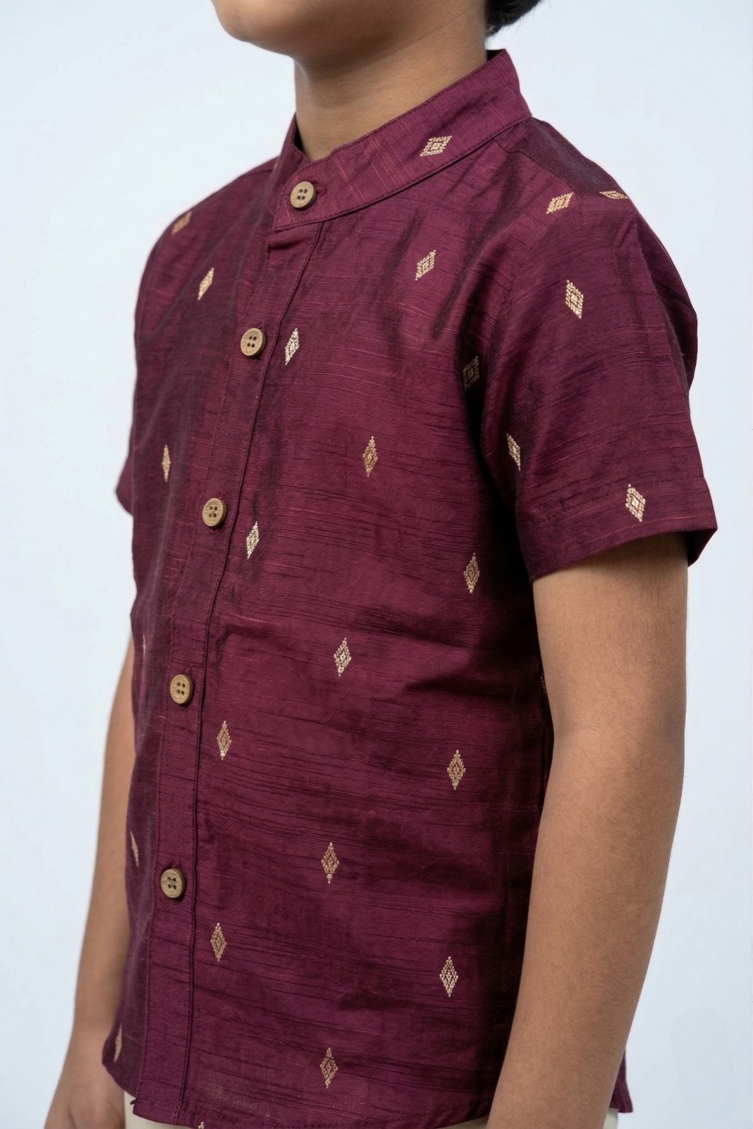 • Solid wine shirt with subtle woven ethnic motifs