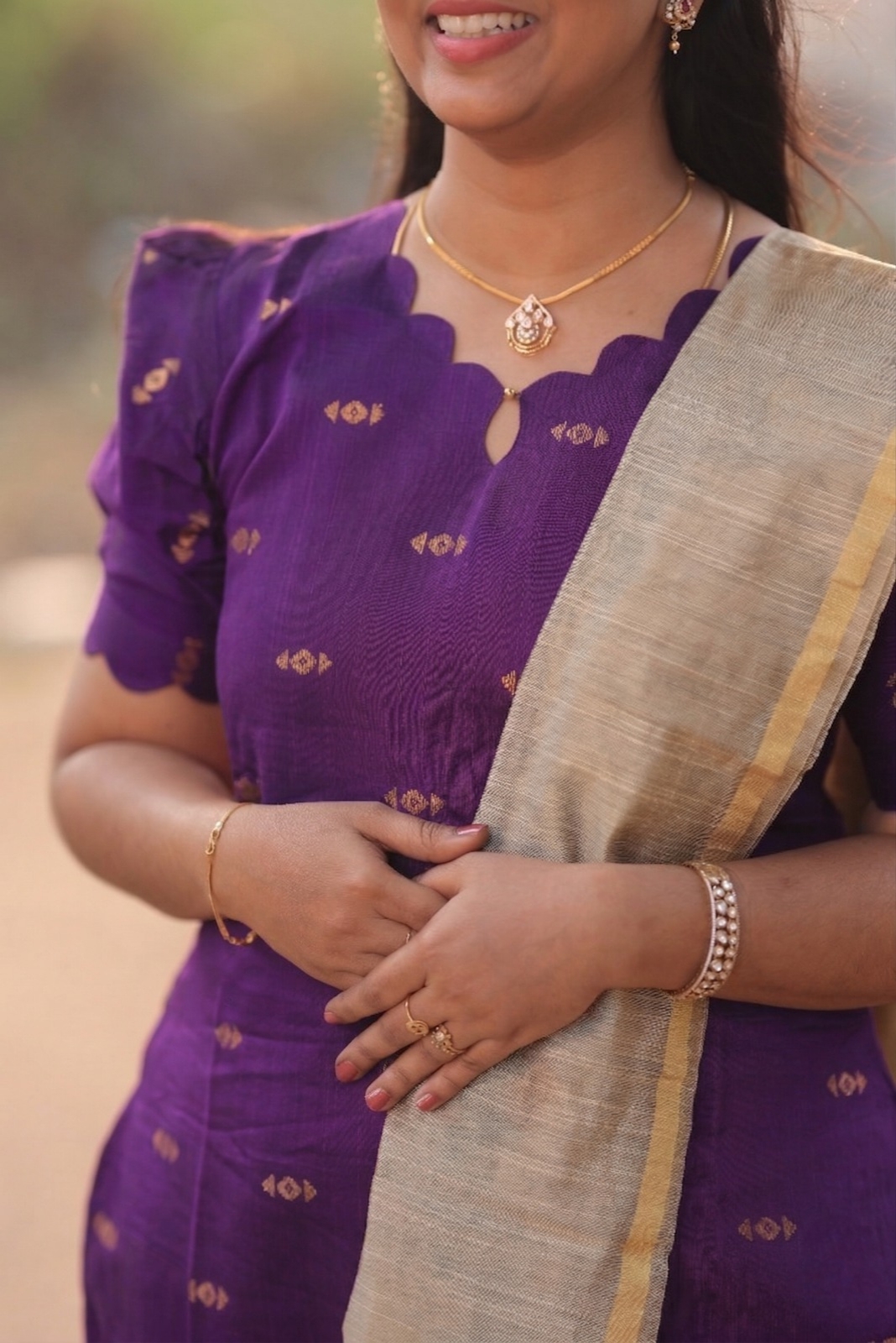 • Solid purple body with subtle woven motifs