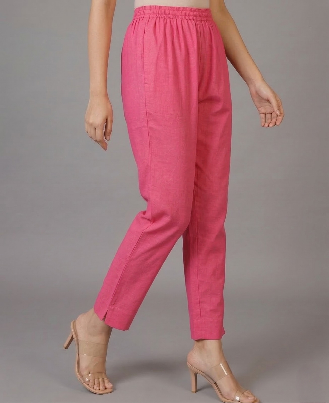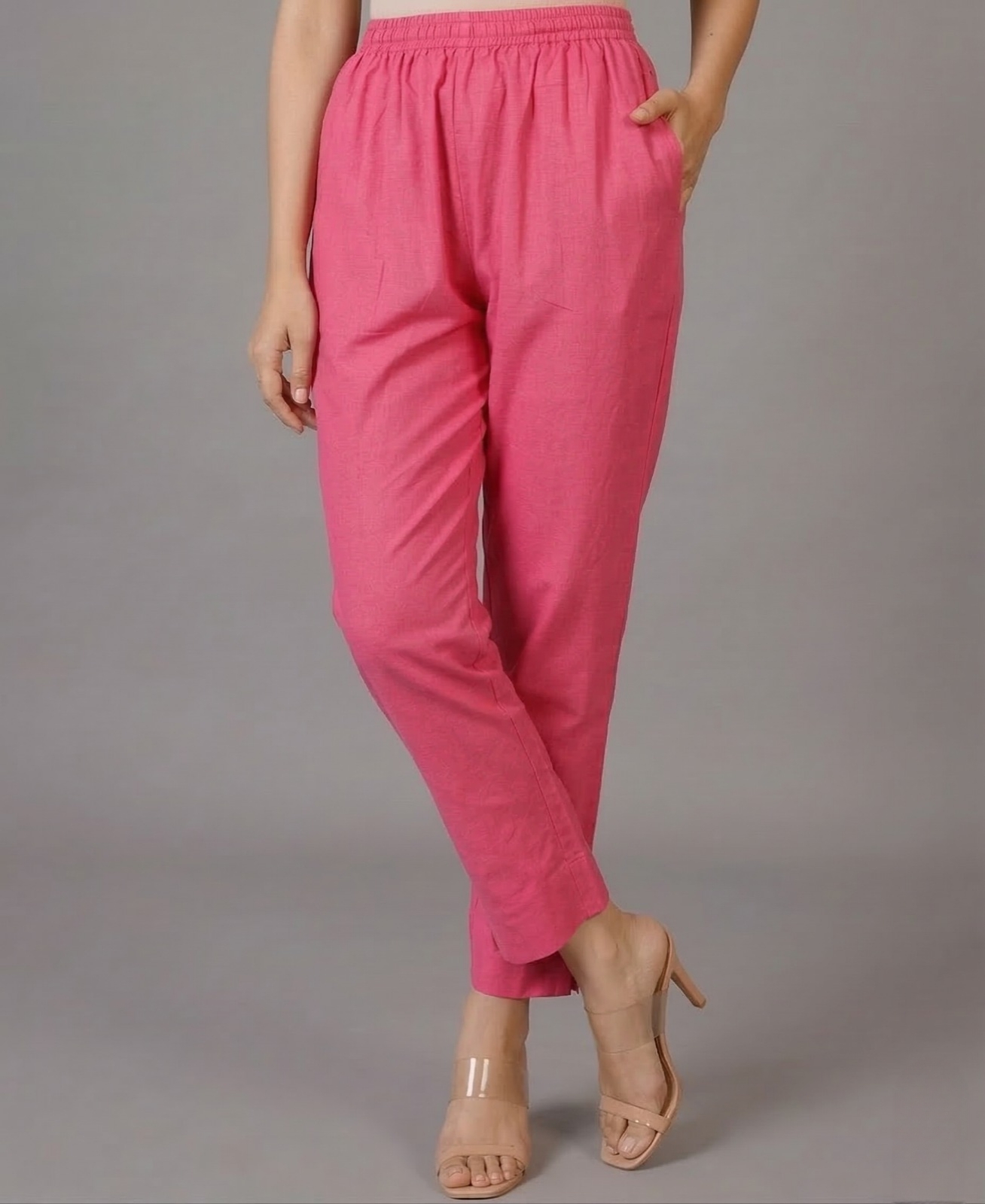 Stay comfortable and stylish with a pair of Classic Pink Solid Cotton Pants. Crafted from high-quality cotton fabric, it features an elasticised waistband and functional side pockets, offering a relaxed fit perfect for everyday wear.