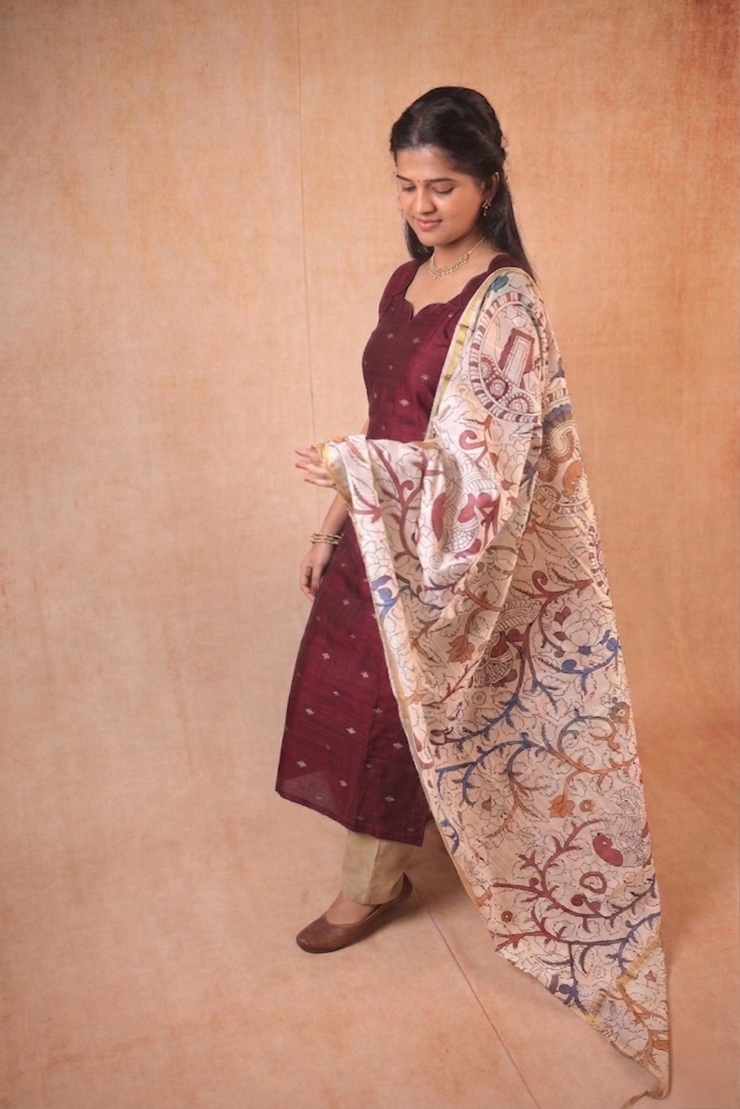 Maroon kurta with kalamkari shawl