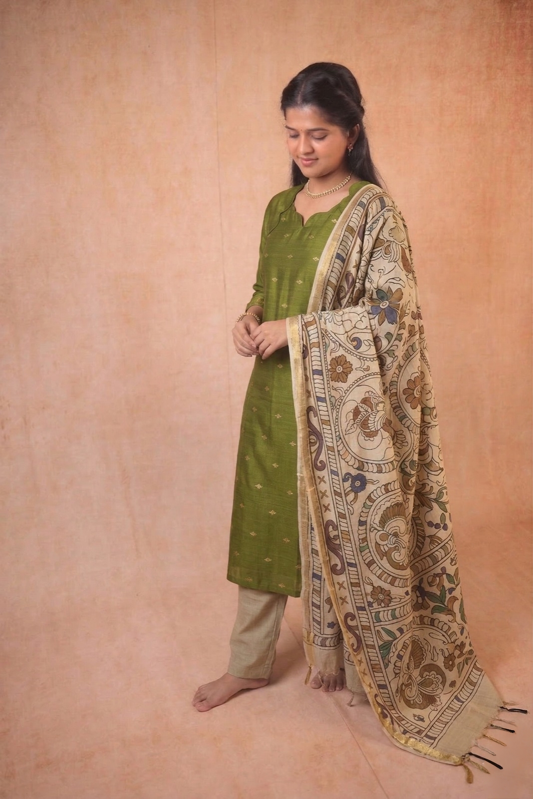 Olive Green kurta with kalamkari shawl