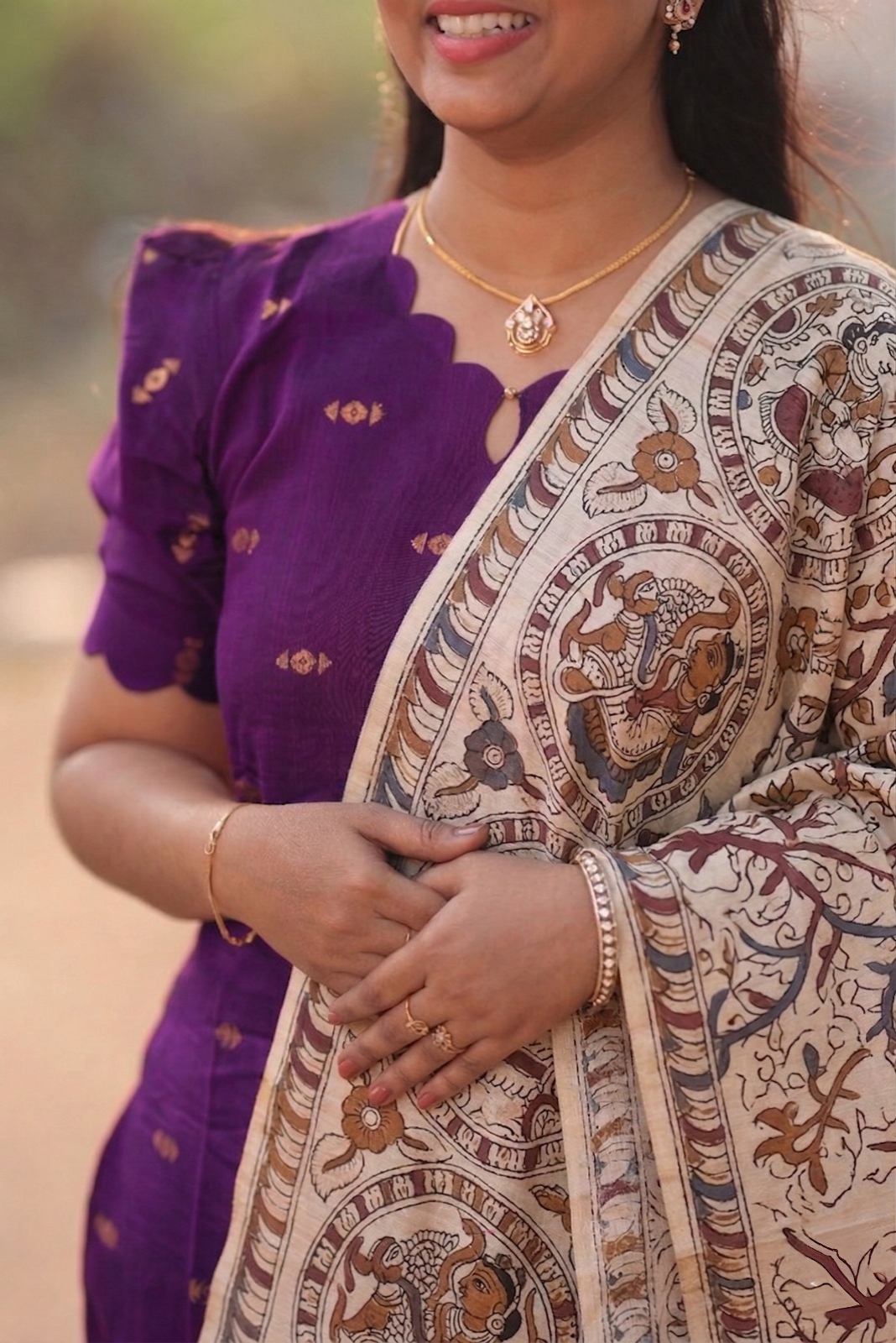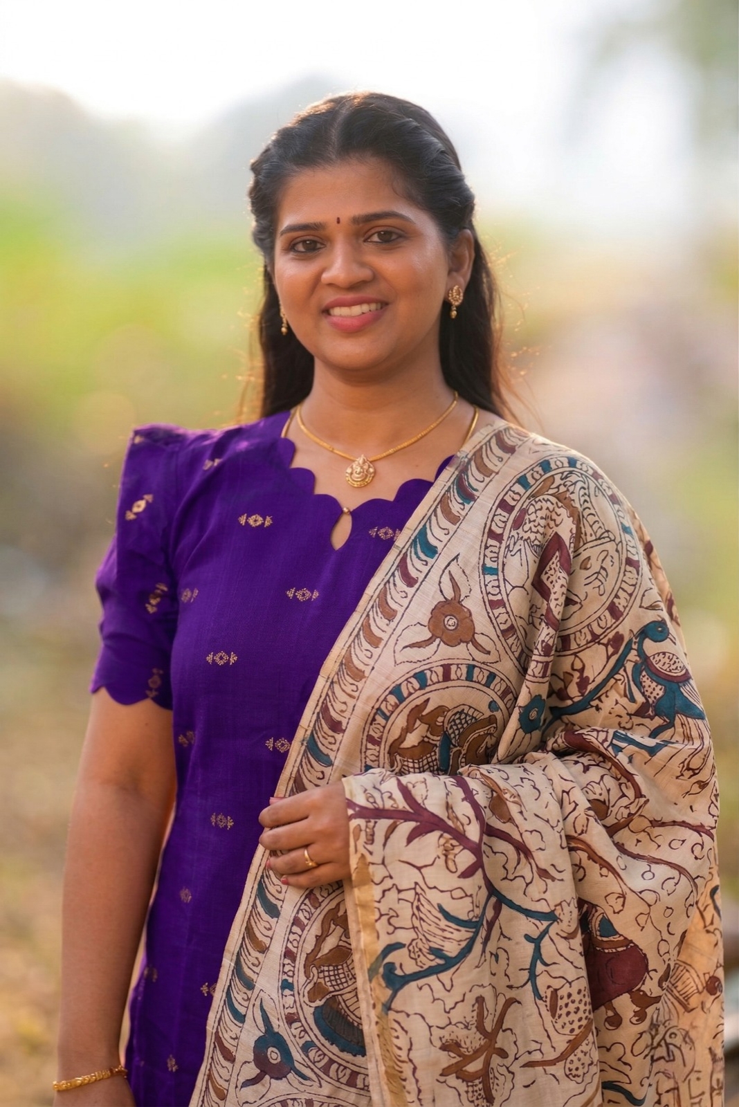 Description Model Details: Model Height: 5.2” Bust Measurement: 36” Wearing: Size M Default Dress Length: 40” ⸻ Fit Details: Fit Type: Regular Fit ⸻ Product Description: Style: Traditional Raw Silk Material: Raw Silk Lining: Yes Pockets: Not Applicable Color: Bottle Green with Kalamkari Dupatta Sleeves: Elbow Length Sleeves Front Neck: Scalloped Round Neck Back Neck: Closed Neck ⸻ Design Details: • Solid deep green body with subtle woven motifs • Contrast coral pink printed pallu with floral design • Rich green border with intricate zari work • Traditional woven patterns on the lower border • Elegant ethnic finish with premium raw silk texture ⸻ Additional Information: • Soft yet structured drape • Lightweight and comfortable for long wear • Ideal for festive wear, traditional occasions, and functions ⸻ Wash Care: • Machine wash on gentle cycle with mild detergent ⸻ Note: • Colour of the outfit may vary slightly due to camera resolution and lighting • Measurements given are of the garment • Feeding customization option is also available • No Exchange / No Return for size issues
