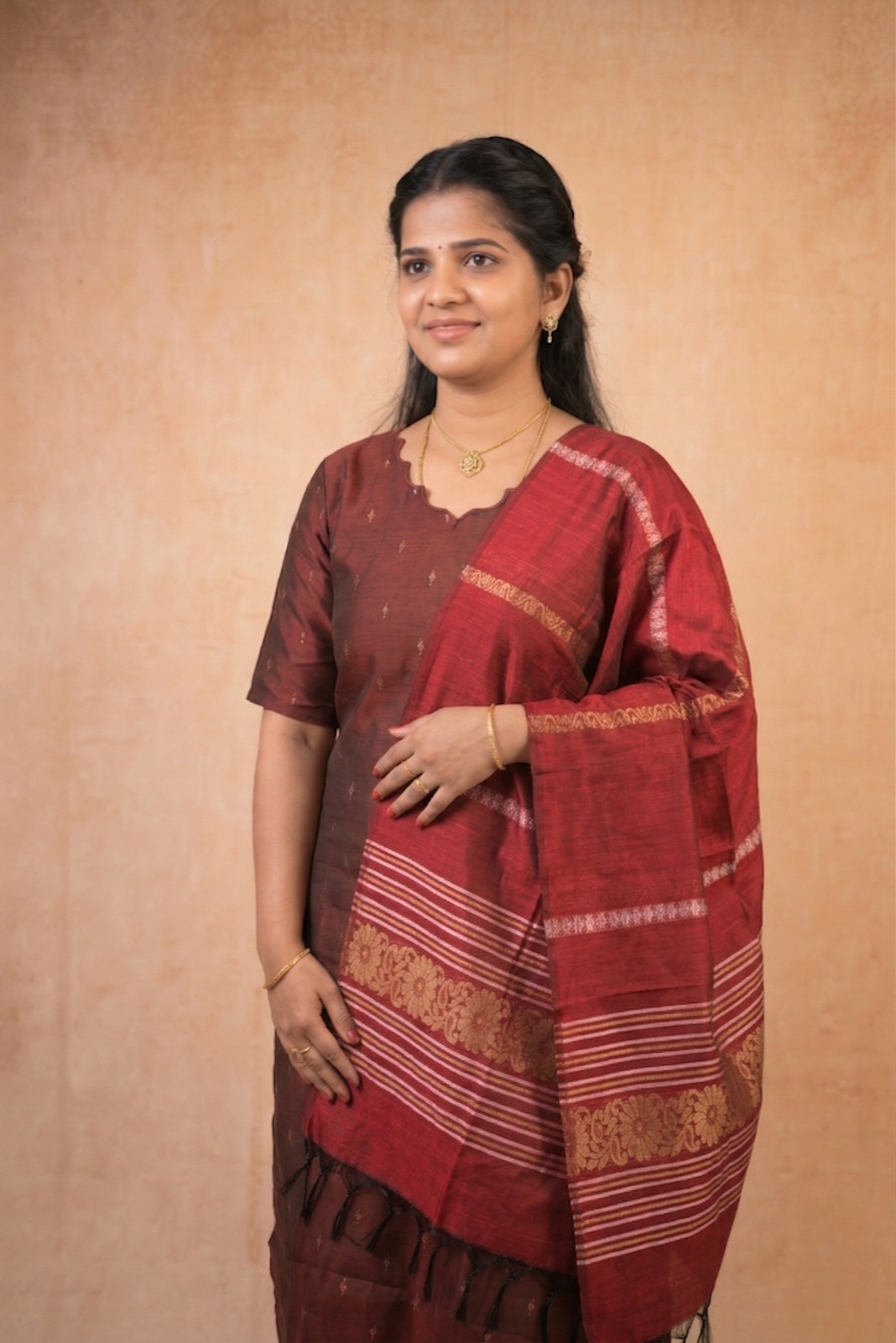 Coffee Brown Kurta with Red Shawl