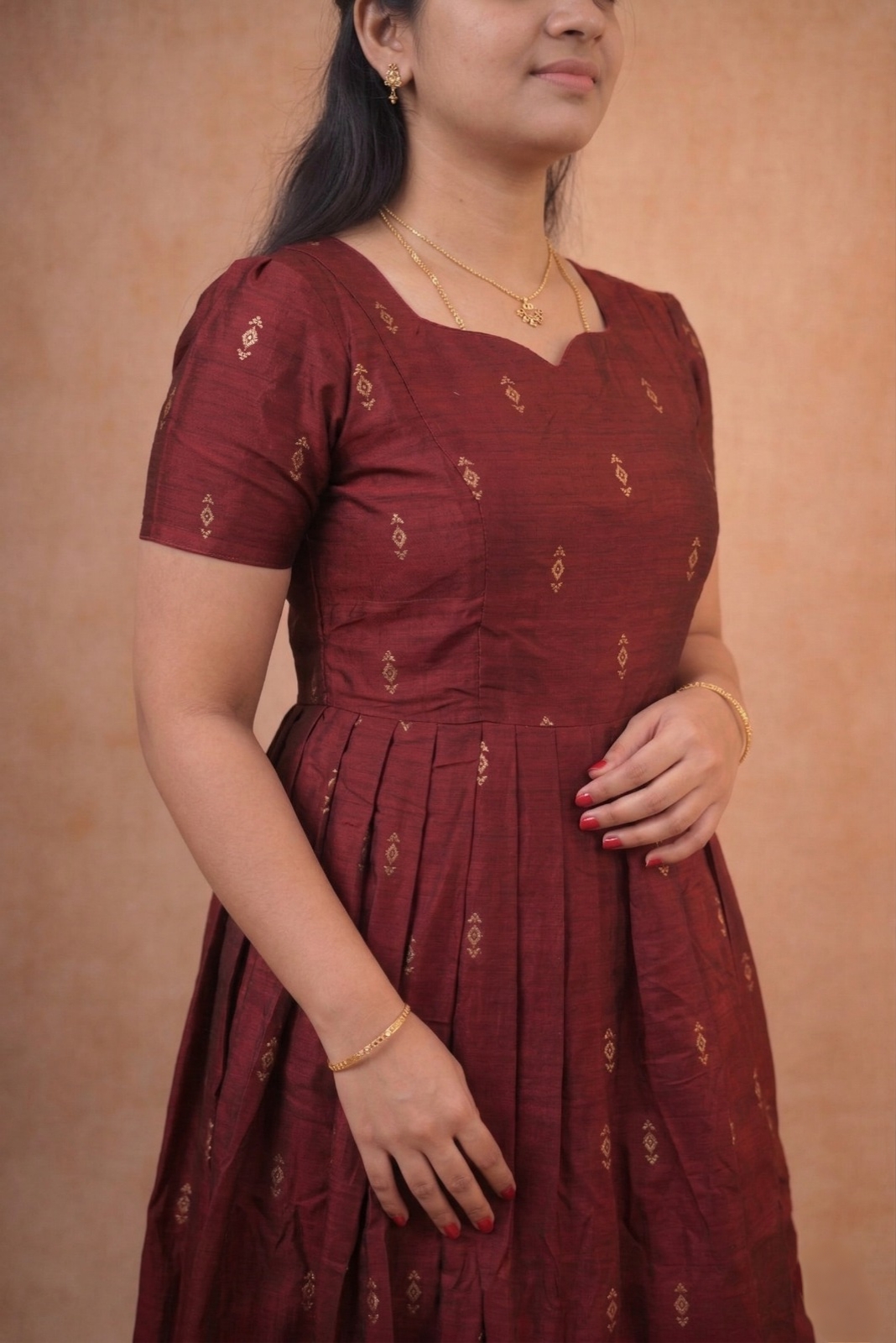 Description Model Details: Model Height: 5.2” Bust Measurement: 36” Wearing: Size M Default Dress Length: 50” ⸻ Fit Details: Fit Type: Regular Fit ⸻ Product Description: Style: Traditional Raw Silk Dress Material: Raw Silk Lining: Yes Pockets: Not Applicable Color: Rani Pink Sleeves: Half Sleeve Front Neck: Scalloped Square Neck Back Neck: Closed Neck ⸻ Design Details: • Solid rani pink body with subtle woven zari motifs • Elegant pleated flare for rich volume and structure • Minimal yet traditional design suitable for all occasions • Smooth finish with premium raw silk texture • Classic ethnic silhouette with modern simplicity ⸻ Additional Information: • Soft yet structured drape • Lightweight and comfortable for long wear • Ideal for festive wear, traditional occasions, and functions ⸻ Wash Care: • Machine wash on gentle cycle with mild detergent ⸻ Note: • Colour of the outfit may vary slightly due to camera resolution and lighting • Measurements given are of the garment • Feeding customization option is also available • No Exchange / No Return for size issues
